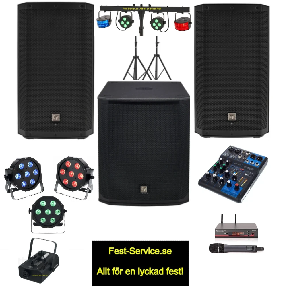 Premium ljudutrustning anpassad för max 75 personer, innehåller 2st kraftfulla aktiva premium-högtalare från EV och 1st bas-högtalare för bästa ljud.