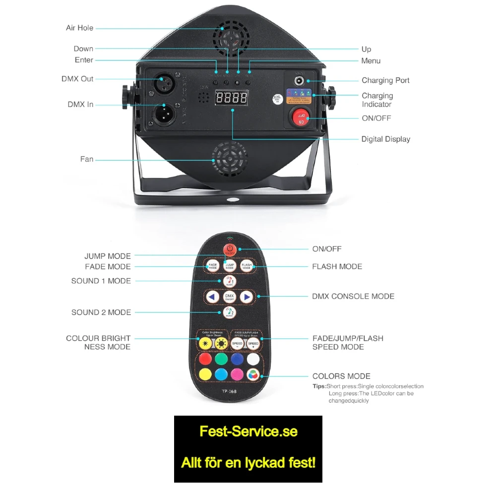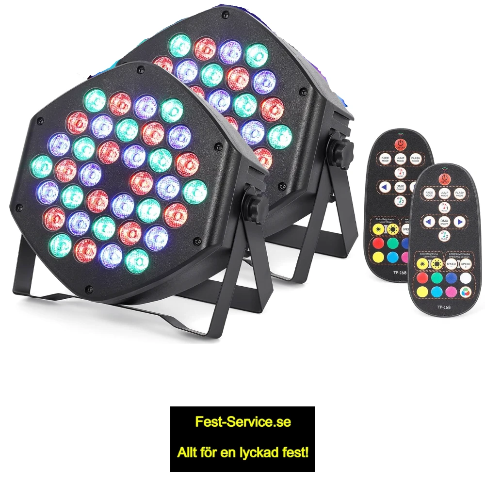 LED PAR-lampor med totalt 36 LED-lampor, med stöd för flera färger och RGB-mix. Lamporna är uppladdningsbara — vilket gör dem idealiska om du vill ha enkel installation utan att dra kablar. I paketet ingår lampa och fjärrkontroll för enkel styrning av läge, färg och ljuseffekter.