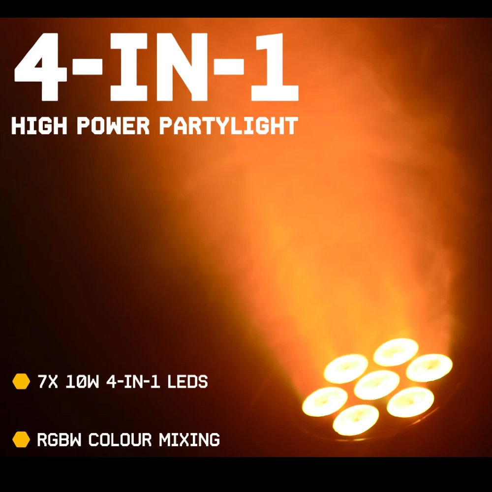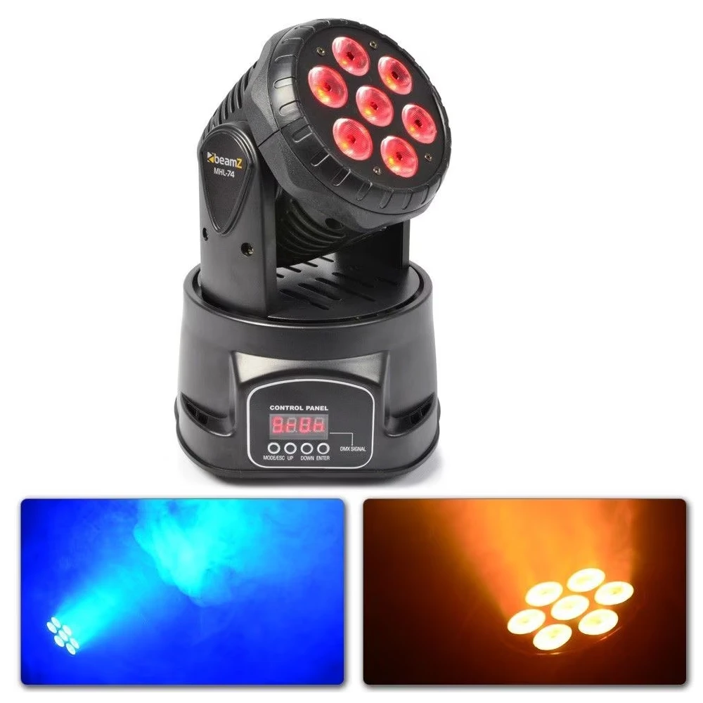 7×10 watts led moving head wash, kraftfull led med rörligt ljus, 8 färger + vit strobe och dimmer.